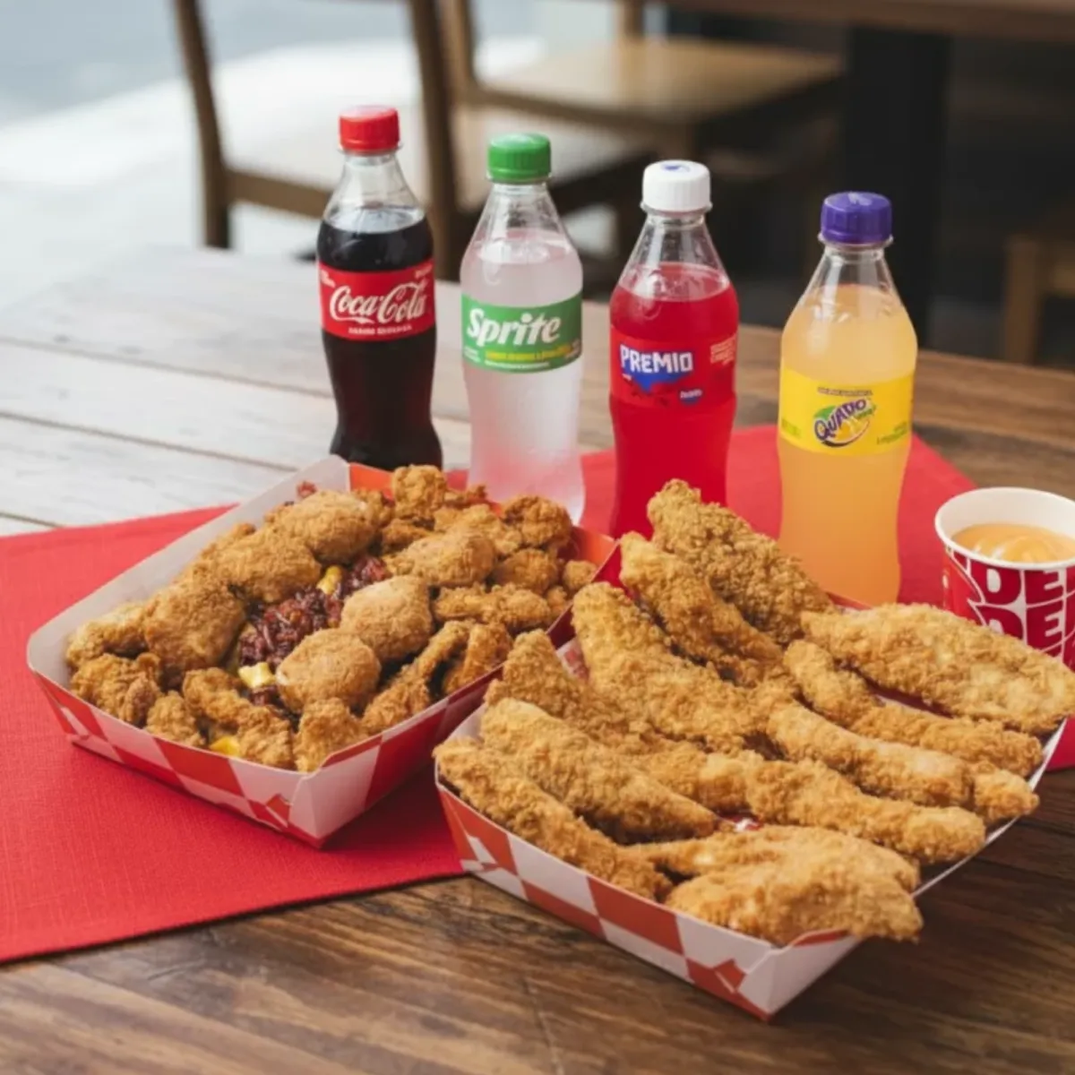 ¡Disfruta de la mejor comida en familia! Nuestro Combo Familiar incluye 12 crujientes Chicken Tenders, 300 gr de papas con Cheddar y tocineta, 200 gr de deliciosos pops, 4 gaseosas y un vaso de salsa de 7 onz.